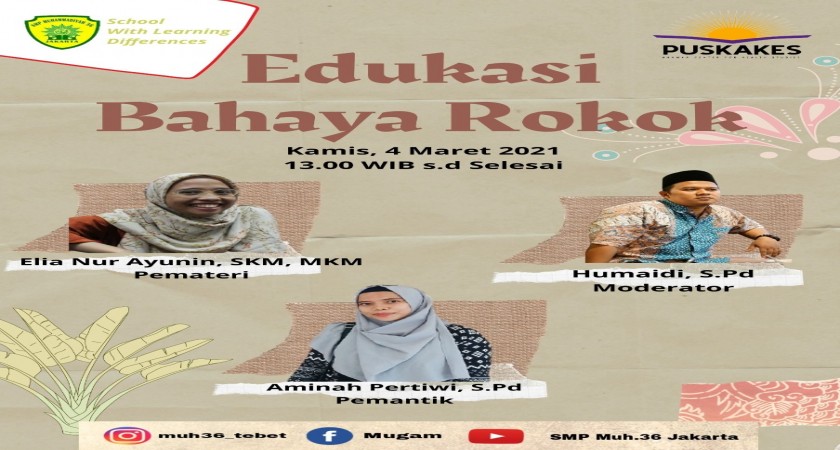 Siswa-siswi SMP Muhammadiyah 36 berpartisipasi dalam rangka kegiatan "Edukasi Bahaya Rokok". Kegiatan ini dilakukan secara virtual dikarenakan pandemic covid 19 yang masih dilanda di seluruh dunia. Acara ini dibawakan oleh Ibu Aminah Pertiwi, S.Pd s dan juga pemateri oleh Ibu Ella Nur Ayunin, SKM, MKM selaku dosen UHAMKA.