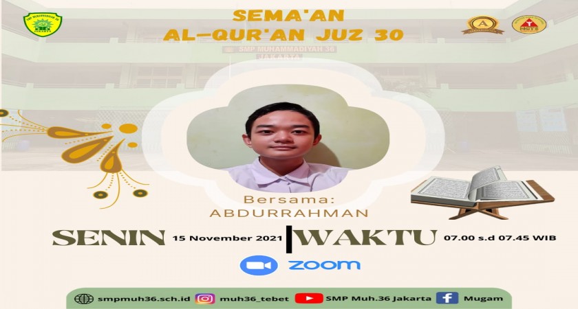 Abdurrahman kelas 7 A dipilih untuk melaksanakan Sema'an Al-Qur'an Juz 30. Dengan adanya kegiatan ini dapat memberikan motivasi siswa untuk semangat dalam berhafal Al-Qur'an. Sehingga siswa dapat terpacu dalam menghafal Al-Qur'an, jika suatu saat nanti selain Abdurrahman ada siswa lain yang ingin tampil Semaa'an Al-Qur'an Juz 30.
