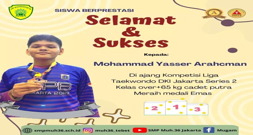 Selamat kepada Mohammad Yasser Arachman yang meraih juara pertama medali Emas dalam kompetisi Liga Taekwondo DKI Jakarta Series 2.
